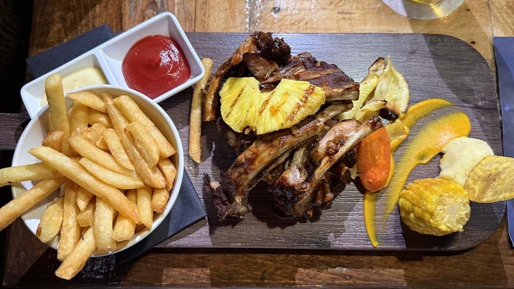 Die Ribs sind hier als “Baby back ribs smoked BBQ sauce” für 39,75 Cg (rund 20 EUR) auf der Karte – mit “Caribbean fruit flavors”. Ich war gespannt! Und es kam wie angekündigt und bestellt: ein ordentliches Rack mit ca. 12-13 Baby-Ribs mit Pommes, etwas Salat und einem Maiskolben. “Caribbean fruit flavors” hatte ich zunächst keine gefunden.