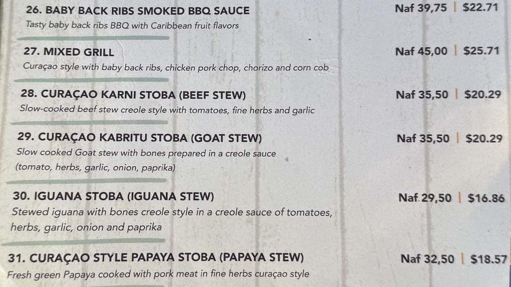 Maike opted for a popular Curacao specialty that she loves: a Stoba. Stobas [link] are stews, similar to goulash, which are available at Blue View in the variants “Karni” (beef), “Kabritu” (goat), “Iguana” and “Papaya” (papaya and pork). Iguana?